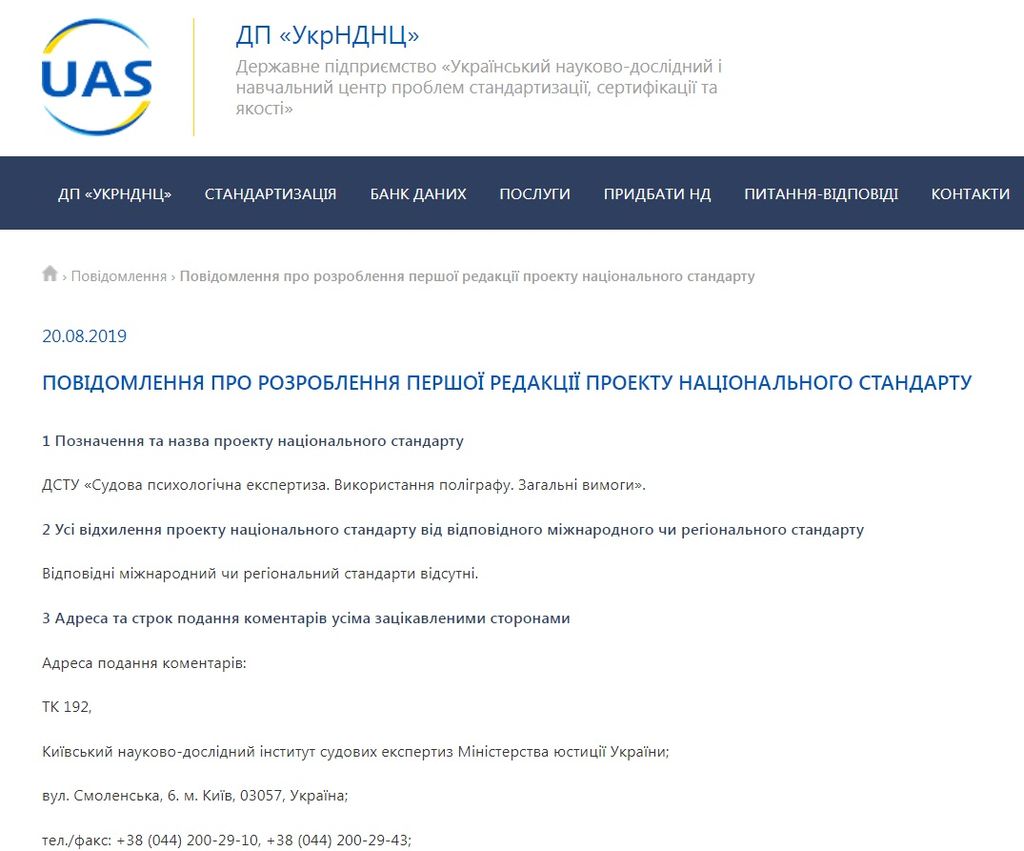20 серпня 2019 року на офіційному Інтернет-сайті Національного органу стандартизації було опубліковано повідомлення про розроблення першої редакції проекту Національного стандарту «Судова психологічна експертиза. Використання поліграфу. Загальні вимоги» погодження з технічним комітетом стандартизації «Судова експертиза» (ТК 192).