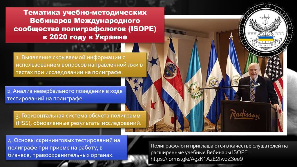 Президентом Международного сообщества полиграфологов Натаном Дж. Гордоном 31 октября 2019 года была утверждена Тематика расширенных учебно-методических Вебинаров Международного сообщества полиграфологов (ISOPE) в 2020 году в Украине для полиграфологов в рамках курса повышения профессиональной квалификации слушателей Международного сообщества полиграфологов. Все желающие полиграфологи приглашаются в качестве слушателей на расширенные учебные Вебинары ISOPE в 2020 году - https://forms.gle/AgzK1AzE2twqZ3ee9