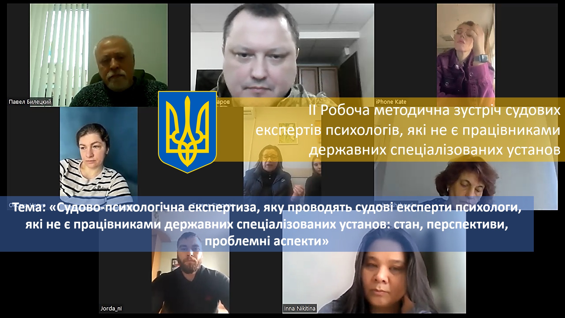 29 грудня 2023 року відбулась ІІ робоча методична зустріч судових експертів психологів, які не є працівниками державних спеціалізованих установ на тему: "Судово-психологічна експертиза, яку проводять судові експерти, які не є працівниками державних спеціалізованих установ: стан, перспективи, проблемні аспекти". Організатором заходу виступив член Президії науково-консультативної та методичної ради з проблем судової експертизи при Міністерстві юстиції України, член секції судово-психологічної експертизи НКМР, атестований судовий екперт психолог (поліграфолог) Назаров Олег Анатолійович. Співучасть у заході прийняла також інший член секції судово-психологічної експертизи НКМР, атестований судовий експерт психолог Бабенко Оксана Олександрівна. Участь у робочій зустрічі взяли атестовані Міністерством юстиції України судові експерти психологи, які не є працівниками державних спеціалізованих установ.