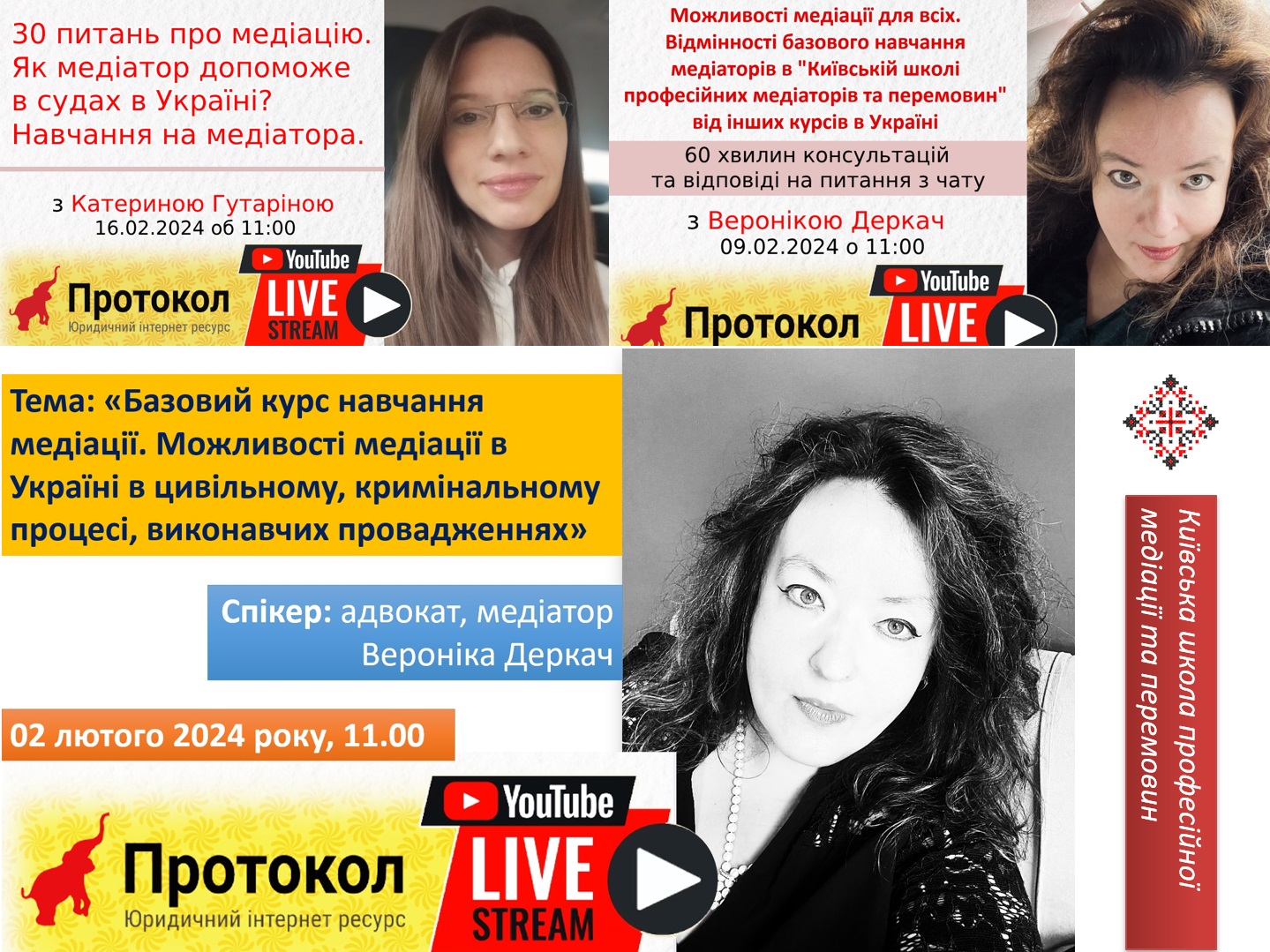 1. Деркач В.В. Базовий курс навчання медіації. Можливості медіації в Україні (в цивільному, кримінальному процесі, при виконанні судових рішень) - Пряме посилання на трансляцію https://www.youtube.com/live/srOvIv7rprw?si=iQQXapxbpil0xXzx