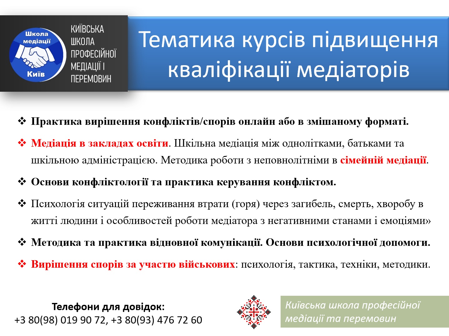 "Київська школа професійної медіації та перемовин" відповідно до Закону України «Про медіацію» здійснює проводить базовий курс навчання медіації в обсязі 90 академічних годин, 60 з яких складають практичні інтерактивні заняття, а також відповідно до Закону України «Про освіту» тематичні курси-модулі з підвищення кваліфікації медіаторів. Умови навчання. Вартість навчання 10 тисяч гривень. Тривалість навчання 21 година - 2 тижні (в курси включаються 2 цикла - теоретичний і практичний). Загальна протяжність курсу 1 місяць. Можлива поетапна оплата. Слухачі забезпечуються навчальними матеріалами.