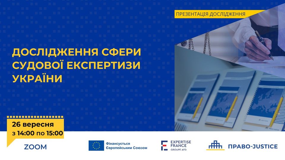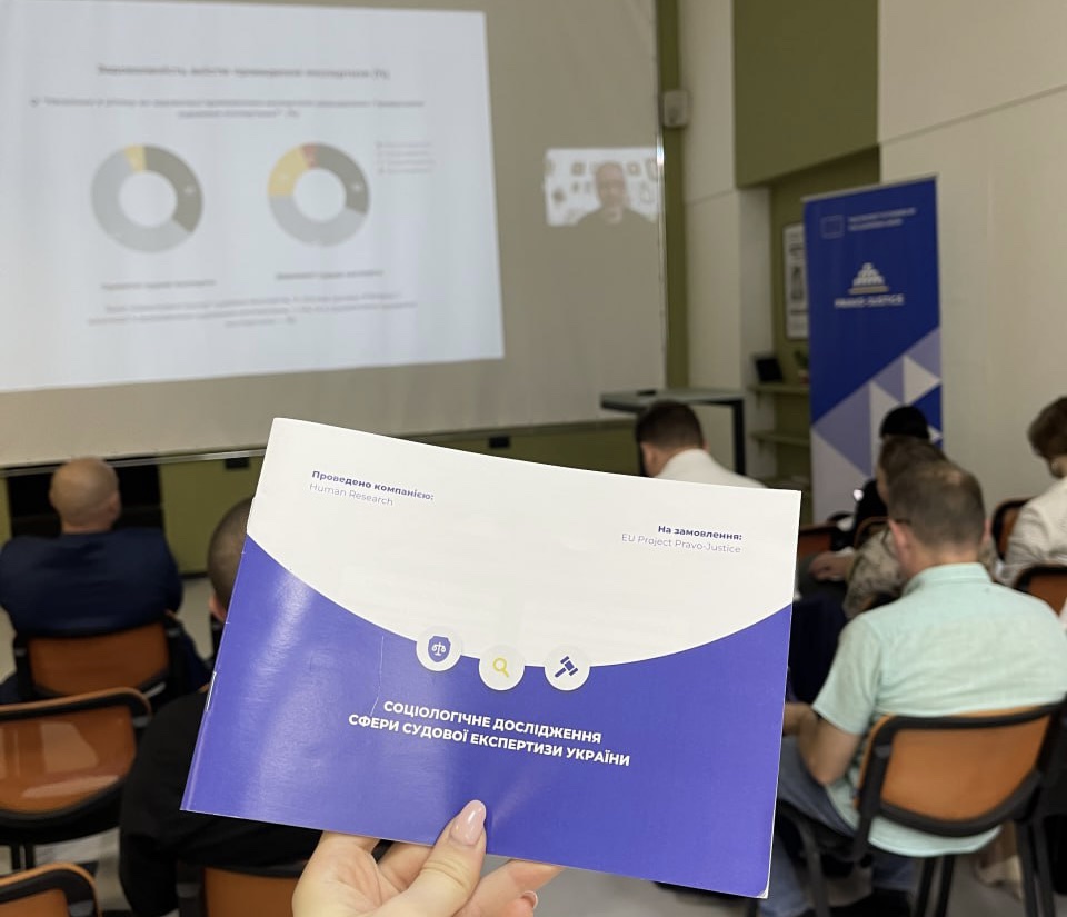 26 вересня 2023 року в місті Києві відбулась презентація результатів соціологічного дослідження сфери судової експертизи України, проведеного на запит Проєкту ЄС "Право-Justice". Дослідження проводилося з 19 травня по 30 червня 2023 року на всій території України, окрім тимчасово окупованих територій Донецької, Луганської, Запорізької, Херсонської областей та Криму. Під час проведення дослідження виконувалися глибинні інтерв'ю з представниками сфери судової експертизи (державні та приватні судові експерти), а також опитування користувачів послуг судових експертів (прокурорів, адвокатів, громадян, які зверталися за судовими експертизами). Варто зауважити, що в Україні не має "приватних" судових експертів, слово "приватний" було привнесено спеціалістами у сфері здійснення діяльності з примусового виконання судових рішень де є фіційно як державні виконавці, так і приватні виконавці та які в Міністерстві юстиції призначалися, або працюють на керівних посадах і таким чином ще не зовсім переналаштувалися на особливості здійснення судово-експертної діяльності в державі.