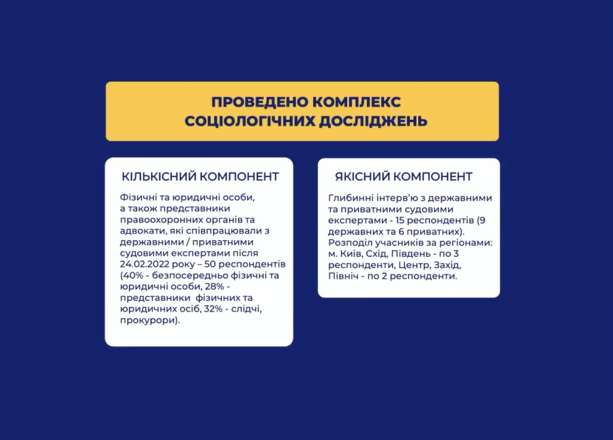 Презентуючи результати дослідження, Микола Гоманюк, кандидат соціологічних наук, розповів про методологію вивчення сфери судової експертизи, яке проводилося із застосуванням глибинних інтервʼю державних та приватних експертів, анкетування фізичних та юридичних осіб, а також представників правоохоронних органів, адвокатів, які були замовниками послуг експертних установ. У межах соціологічного дослідження опитані судові експерти відзначили, що з початком повномасштабної війни та необхідністю фіксувати руйнування, проводити вибухотехнічні, пожежно-технічні, будівельні, товарознавчі, економічні, лінгвістичні експертизи, експертизи зброї, обсяг навантаження державних експертів суттєво збільшився.
