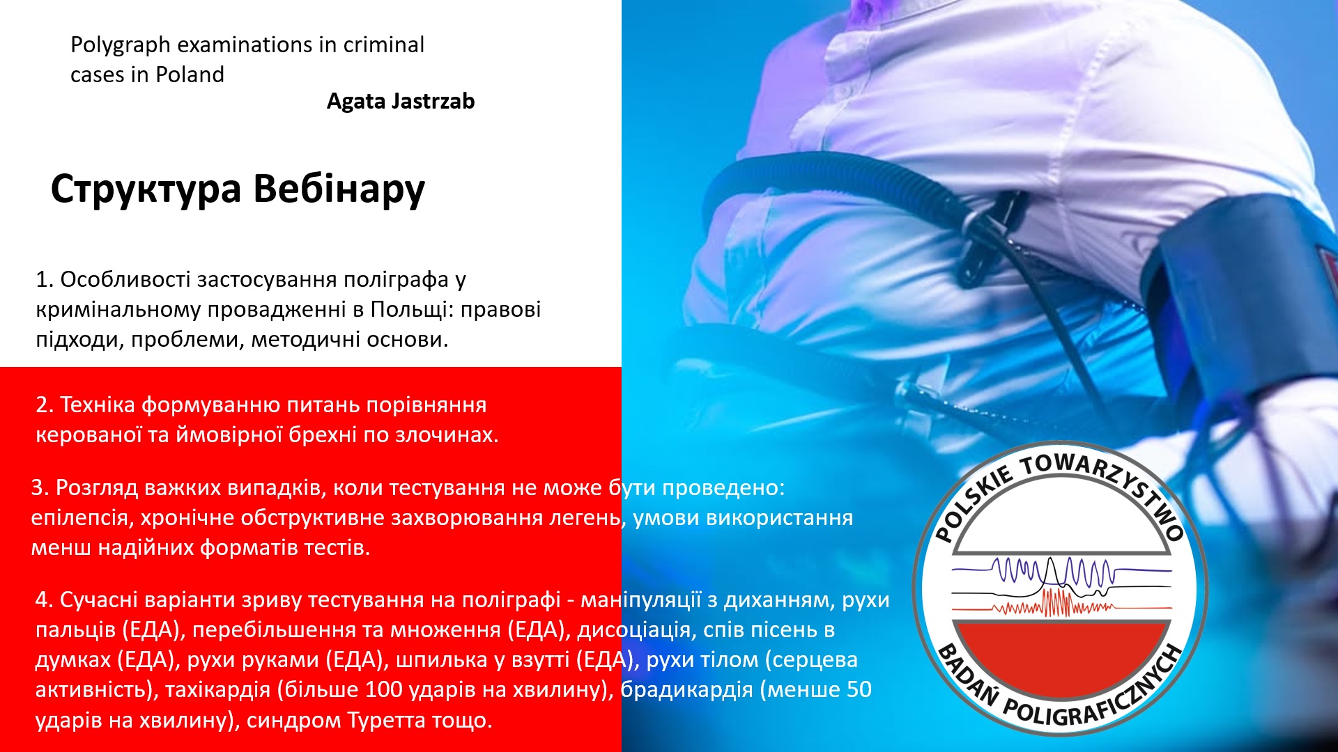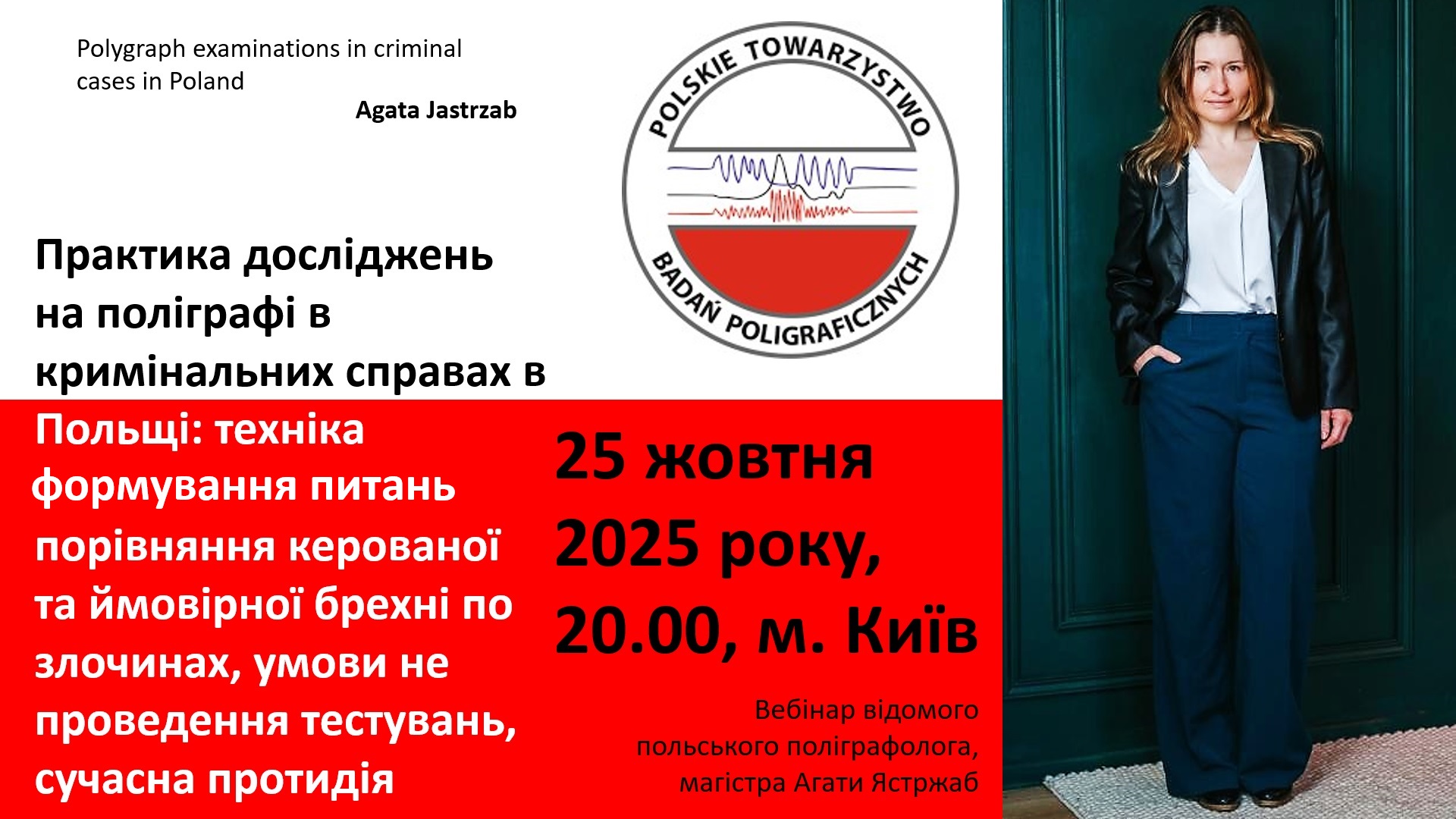 25 жовтня 2025 року о 20.00 за Київським часом представником Міжнародного співтовариства поліграфологів в Україні, директором Інституту психологічної експертизи і поліграфа (м. Київ), кандидатом психологічних наук, доцентом Олегом Назаровим організовано проведення навчально-методичного Вебінару підвищення кваліфікації судових експертів психологів, поліграфологів відомого польського поліграфолога Агати Ястржаб (Agata Jastrzab) на тему: "Практика досліджень на поліграфі (варіографічні дослідження) в кримінальних справах в Польщі: техніка формування питань порівняння керованої та ймовірної брехні по злочинах, умови не проведення тестувань, сучасна протидія".