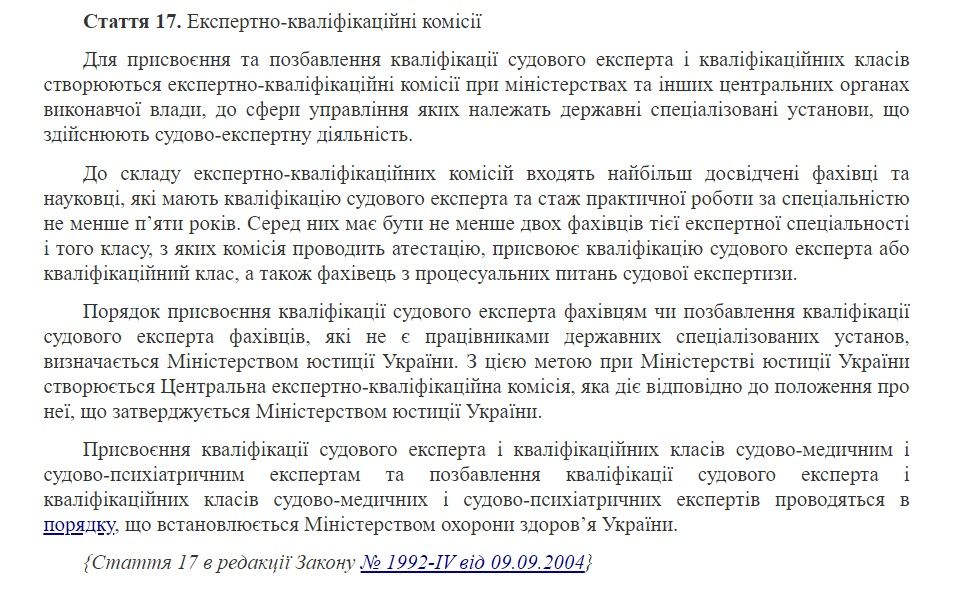 Частиною першої статті 17 Закону України «Про судову експертизу» встановлено, що для присвоєння та позбавлення кваліфікації судового експерта і кваліфікаційних класів створюються експертно-кваліфікаційні комісії при міністерствах та інших центральних органах виконавчої влади, до сфери управління яких належать державні спеціалізовані установи, що здійснюють судово-експертну діяльність.