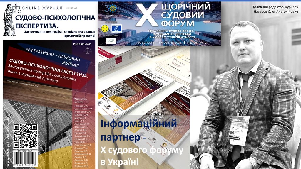 Анонсуємо незабаром на сторінках журналу цікаві інтерв'ю з суддями Верховного Суду щодо погляду на проблемні аспекти судової експертизи в Україні. Науковий online журнал «Судово-психологічна експертиза. Застосування поліграфа і спеціальних знань в юридичній практиці» став інформаційним партнером X Щорічного судового форуму «Незалежна судова влада – фундамент держави в умовах турбулентності», який проходив 30 вересня-01 жовтня 2021 року в місті Києві за ініціативи Асоціації правників України. Участь у заході приймали головний редактор журналу Назаров Олег Анатолійович та журналісти видання - Деменко Ксенія Сергіївна та Держилов Дмитро Ігорович.