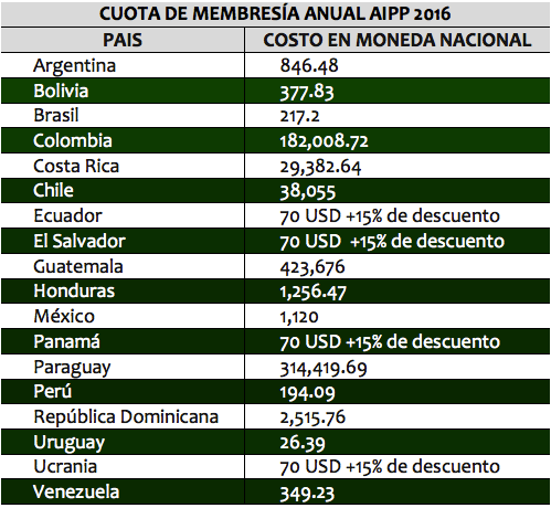 В 2016 году регистрационный и ежегодный членский взнос в AIPP установлен в размере эквивалентном 70 долларам США согласно таблицы.