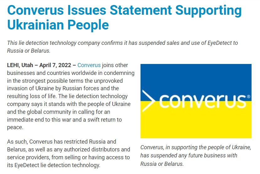 Міжнародна компанія Converus Inc. - розробник сучасного поліграфа EyeDetect виступила із заявою на підтримку українського народу та підтверджує, що призупинила продаж та використання EyeDetect у Росії чи Біларусі. З офіційної заяви Converus Inc.: «ЛЕХІ, Юта – 7 квітня 2022 р. – Конверус приєднується до інших компаній та країн у всьому світі і найрішучішим чином засуджує невпровоковане вторгнення російських військ в Україну та пов'язану з цим загибель людей». Компанія, яка займається технологіями виявлення прихованої інформації, заявляє, що разом із народом України та світовою спільнотою закликає до негайного припинення цієї війни та якнайшвидшого повернення до миру. Converus заборонив країнам Росії та Білорусі, а також будь-яким авторизованим дистриб'юторам та постачальникам послуг продавати або мати доступ до своєї технології з виявлення прихованої інформації EyeDetect.