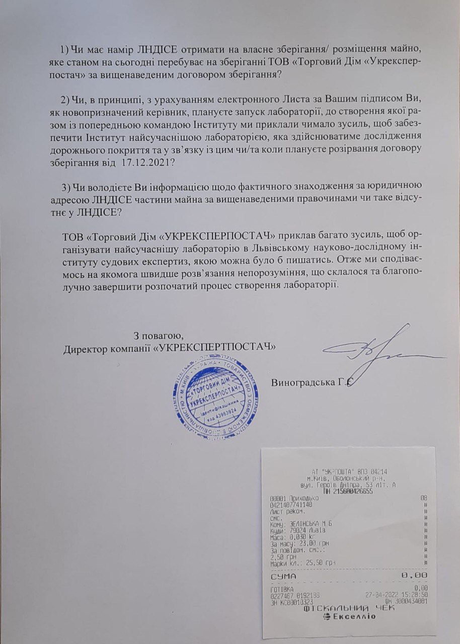 4. Листи підприємства УКРЕКСПЕРТПОСТАЧ від 26.04.2022, від 08.04.2022 щодо збереження майна ЛНДІСЕ, яке було придбано НДІ під час тендерних торгів в 2021 році.