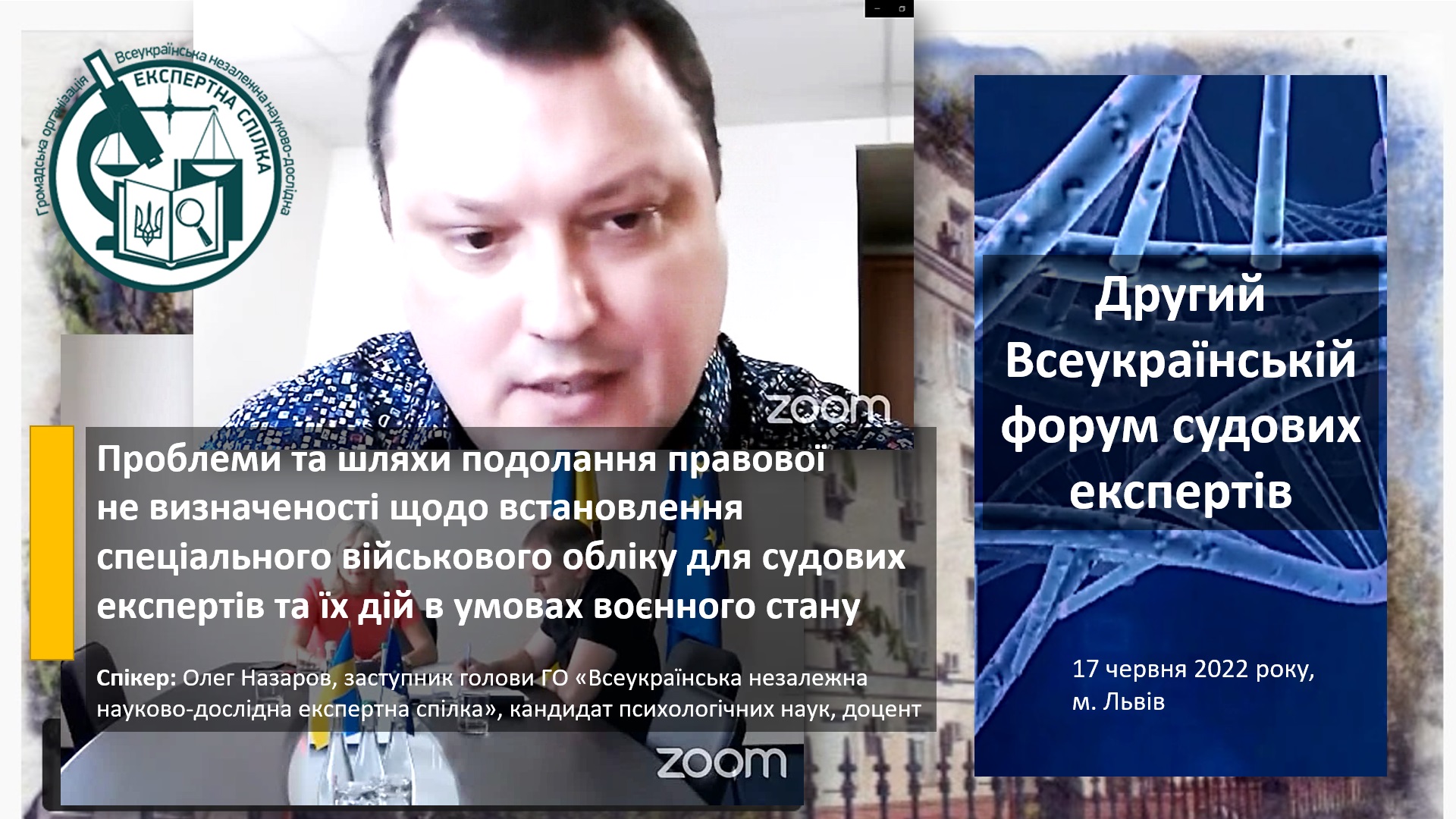 Виступ Олега Назарова, заступника голови ГО "Всеукраїнська незалежна науково-дослідна експертна спілка" на тему: "Проблеми та шляхи подолання правової не визначеності щодо встановлення спеціального військового обліку для судових експертів та їх дій в умовах воєнного стану" пропонується увазі читачів журналу.