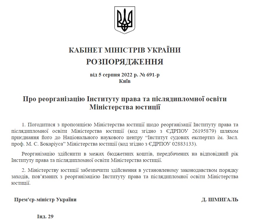 Розпорядженням Кабінету Міністрів України від 05 серпня 2022 року №691-р вирішено погодитися з пропозицією Міністерства юстиції щодо реорганізації Інституту права та післядипломної освіти Міністерства юстиції шляхом приєднання його до Національного наукового центру «Інститут судових експертиз ім. засл. проф. Н. С. Бокаріуса» Міністерства юстиції. Реорганізація здійснюватиметься у межах бюджетних коштів, передбачених на відповідний рік Інституту права та післядипломної освіти Міністерства юстиції. Міністерство юстиції має забезпечити здійснення в установленому законодавством порядку заходів, пов'язаних із реорганізацією Інституту права та післядипломної освіти Міністерства юстиції.