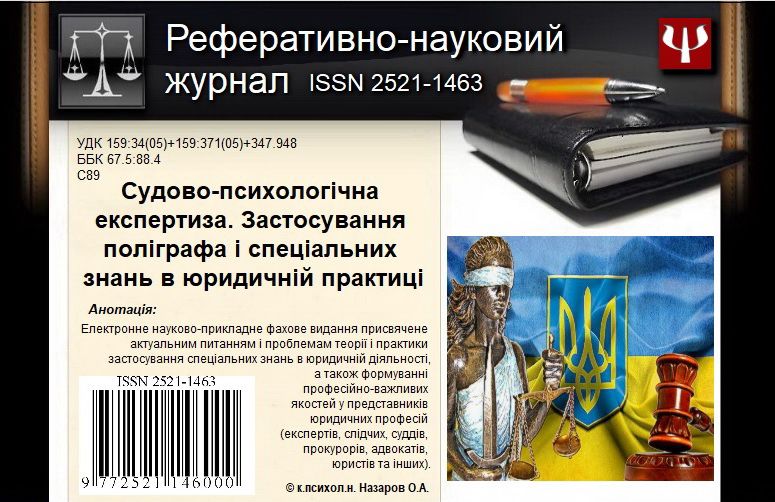 Традиційно, нагадуємо користувачам журналу, що науковий журнал запроваджив надання послуг «Консультація»: запит на проведення судово-психологічної експертизи за різними підставами, у тому числі відшкодування моральної шкоди завданою військовими злочинами, із застосуванням поліграфа на замовлення зацікавлених осіб, суду, правоохоронних органів згідно процесуальних кодексів. - URL: http://expertize-journal.org.ua/konsultacia Телефон для термінового дзвінка судовому експерту: +38 093 476 72 60 (Viber, Telegram, Whatsapp).