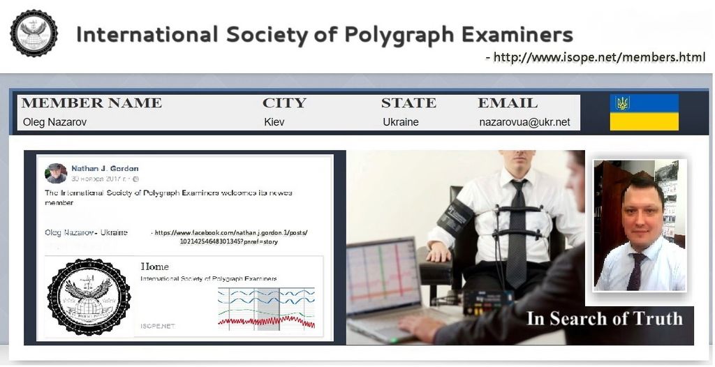 Представитель Украины, полиграфолог, кандидат психологических наук Назаров Олег Анатольевич, включен в состав Международного сообщества полиграфологов (США). Международное сообщество полиграфологов (англ. - International Society of Polygraph Examiners, сокр. ISOPE) – международная общественная профессиональная организация, которая была зарегистрирована в 2013 году в США известным американским полиграфологом Натаном Дж. Гордоном.