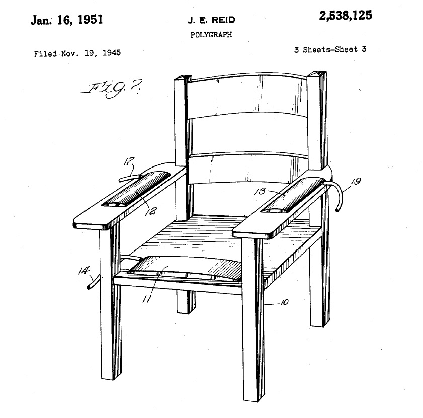 Перше поліграфологічне крісло у світі для підвищення якості проведення психофізіологічних досліджень на поліграфі було розроблене в 1945 році та запатентоване Джоном Рідом в 1951 році. На малюнку фото розробленого в 1945 році першого поліграфологічного крісла Дж. Рідом, яке було запатентовано Дж. Рідом разом з розробленим поліграфом в 1951 році. Джерело: Polygraph. John E. Reid, inventor. U.S. Patent No. 2,538,125. 16 January 1951 / Поліграф. Джон Е. Рід, винахідник. Патент США №2,538,125. 16 січня 1951 р.