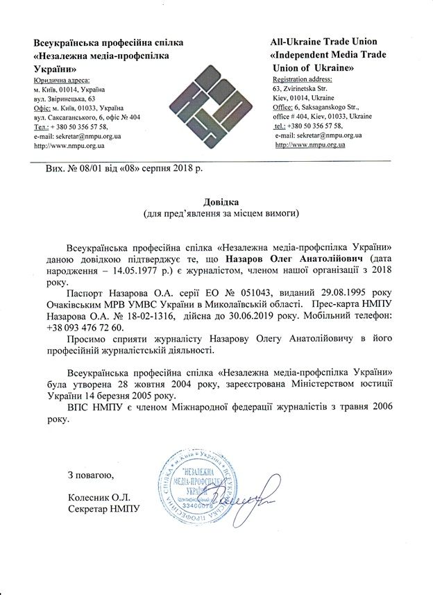 В підготовленій довідці-зверненні (для пред'явлення за місцем вимоги) від 08.08.2018 року № 08/01 Всеукранська професійна спілка "Незалежна медіа-профспілка України" висловлює клопотання про сприяння журналісту Назарову О.А. в його професійній журналістській діяльності.