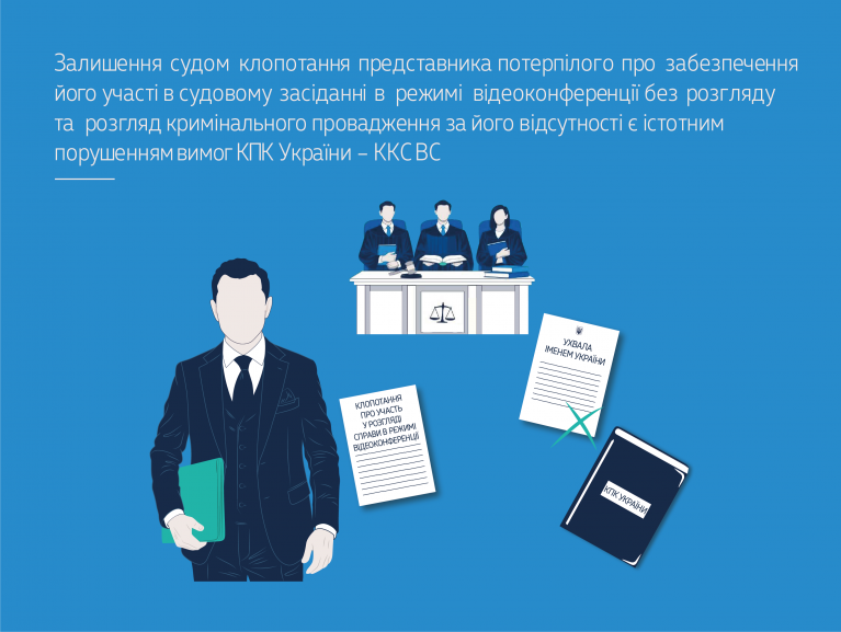 У цьому кримінальному провадженні суди попередніх інстанцій визнали винуватим і засудили обвинуваченого за ч. 2 ст. 286 КК України. У касаційній скарзі потерпіла зазначила, що її представник подав до суду клопотання про участь у розгляді справи в суді апеляційної інстанції в режимі відеоконференції з використанням власних технічних засобів, однак суд це клопотання не розглянув і не повідомив представника потерпілої про результати його розгляду. Скасовуючи ухвалу апеляційного суду та призначаючи новий розгляд у суді апеляційної інстанції, Верховний Суд вказав, що відповідно до положень ч. 4 ст. 58 КПК України представник потерпілого користується процесуальними правами потерпілого, інтереси якого він представляє, крім процесуальних прав, ...