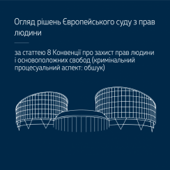 В огляді подано вибірку практики ЄСПЛ за ст. 8 Конвенції щодо захисту права на повагу до приватного та сімейного життя, а також інших її вимог, які можуть бути порушені під час обшуку.