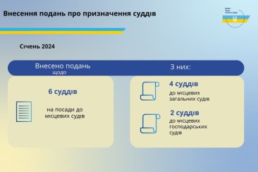 З початку 2024 року Вища ради правосуддя ухвалила рішення про внесення подання Президентові України про призначення 6 суддів на посади до місцевих судів, з них: