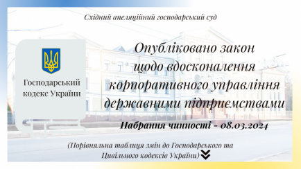 Сьогодні, 7 березня 2024 року, у газеті «Голос України» опублікований Закон України «Про внесення змін до деяких законодавчих актів України щодо вдосконалення корпоративного управління» від 22 лютого 2024 року № 3587-IX. Цей Закон набирає чинності з дня, наступного за днем його опублікування, тобто 8 березня 2024.