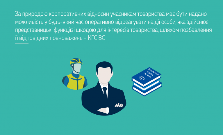З огляду на викладене припинення повноважень президента ФВСУ відповідно до ч. 3 ст. 99 ЦК України є дією уповноваженого органу товариства, спрямованою на унеможливлення здійснення членом його виконавчого органу управлінської діяльності. Необхідність такої норми зумовлена специфічним статусом члена органу, який отримав від уповноваженого органу товариства право на управління. За природою корпоративних відносин учасникам товариства має бути надано можливість у будь-який час оперативно відреагувати на дії особи, яка здійснює представницькі функції зі шкодою (чи можливою шкодою) для інтересів товариства, шляхом позбавлення її відповідних повноважень. Така форма захисту є специфічною дією носіїв корпоративних прав у відносинах з особою, якій вони довірили здійснювати управління товариством.