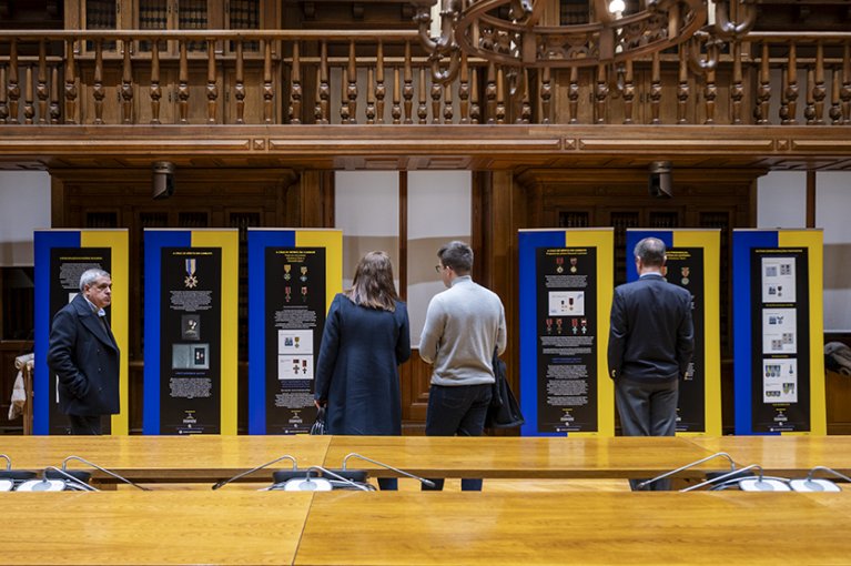 До кінця липня в Палаці правосуддя експонується виставка «Нові українські військові відзнаки: відзнаки України на війні». Перед тим вона була розміщена в парламенті Португалії, відкривав її Президент парламенту Португалії.