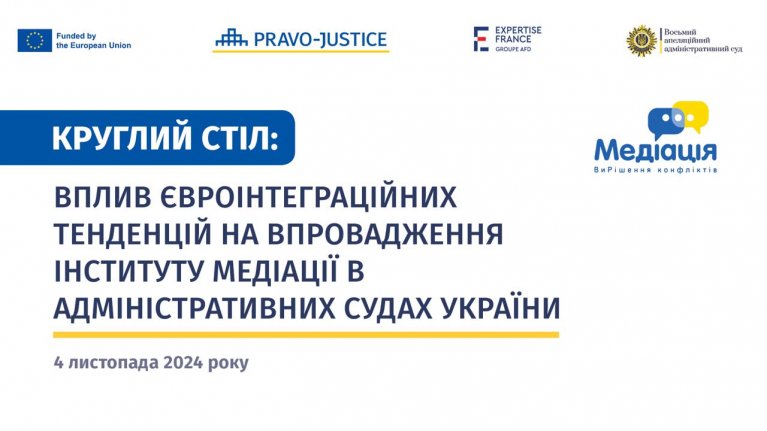 4 листопада 2024 року у місті Львові відбувся круглий стіл на тему «Вплив євроінтеграційних тенденцій на впровадження інституту медіації в адміністративних судах України». Даний захід було організовано Касаційним адміністративним судом у складі Верховного суду та Восьмим апеляційним адміністративним судом спільно з Проєктом ЄС «Право-Justice» в Україні.