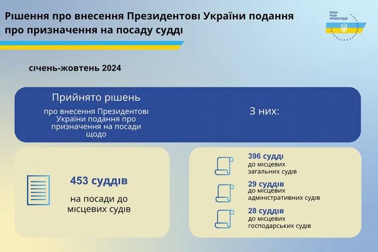 З початку 2024 року ВРП ухвалила внести Президентові України подання про призначення більше 450 суддів