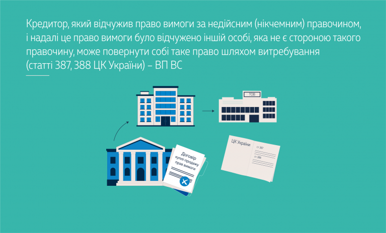 Водночас якщо кредитор відчужив право вимоги в зобов’язанні за недійсним (нікчемним) правочином і надалі це право вимоги було відчужено іншій особі, яка не є стороною недійсного (нікчемного) правочину, то кредитор може повернути собі таке право вимоги лише за результатами його витребування в порядку, передбаченому статтями 387, 388 ЦК України. У разі, якщо таке право вимоги не підлягає витребуванню відповідно до зазначених норм, то інша особа (добросовісний набувач) набуває право на нього відповідно до ст. 330 ЦК України.