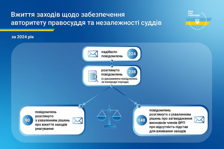 224 повідомлення про втручання у професійну діяльність суддів щодо здійснення правосуддя та дії, що порушують гарантії незалежності суддів або підривають авторитет правосуддя, надійшло до Вищої ради правосуддя у 2024 році. З урахуванням повідомлень, які надійшли в попередні періоди, Рада упродовж 2024 року розглянула 238 повідомлень суддів.
