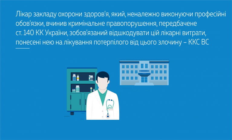 У цьому кримінальному провадженні лікаря акушера-гінеколога засуджено за ч. 2 ст. 140 КК України, оскільки неправильне надання нею медичної допомоги породіллі призвело до асфіксії та подальшої смерті новонародженого. Прокурор в інтересах держави в особі обласної ради, яка є розпорядником грошових коштів дитячої лікарні, де працювала лікар акушер-гінеколог, звернувся до останньої з цивільним позовом про відшкодування шкоди, завданої кримінальним правопорушенням, пов’язаної з лікуванням новонародженого, тому що це лікування є наслідком неналежного виконання своїх обов’язків саме лікарем. Суди попередніх інстанцій відмовили в задоволенні цивільного позову прокурора.