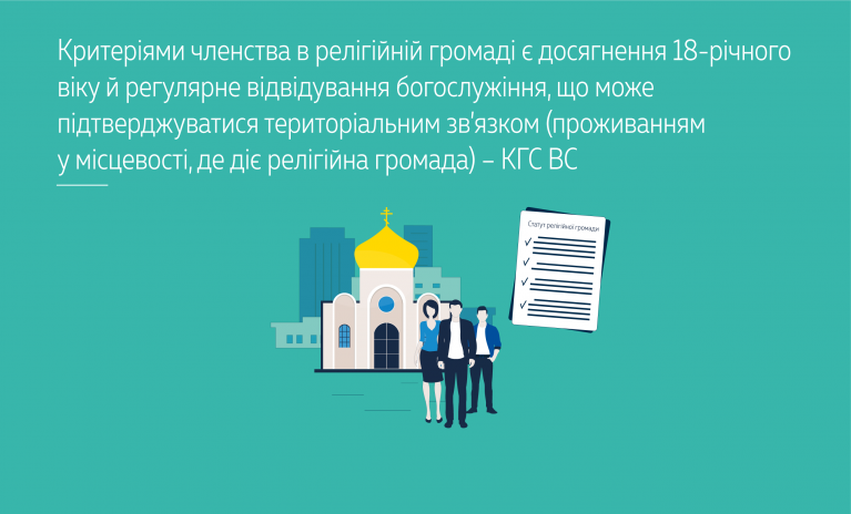 Якщо статутом релігійної громади чітко не визначено порядку прийняття до членів громади, фіксованого членства, такими критеріями, відповідність яким може бути об’єктивно встановлена, є досягнення 18-річного віку й регулярне відвідування богослужіння, зокрема через територіальний зв’язок з релігійною громадою, тобто проживання в місцевості, де вона діє.