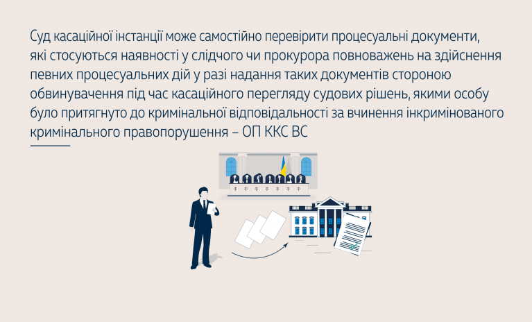 Оцінюючи зазначені касаційні вимоги, ОП ККС ВС вказала, що процесуальні документи, які підтверджують наявність повноважень у певної особи, не є доказами у провадженні, тому суд касаційної інстанції може перевірити наявність повноважень у слідчого, прокурора на проведення ними тих чи інших процесуальних дій у цьому провадженні на підставі наданих прокурором документів.
