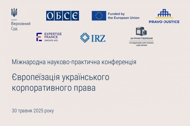 З нагоди 34-ї річниці утворення господарських (арбітражних) судів України 30 травня 2025 року Верховний Суд за підтримки проєкту Спеціального представника Головування ОБСЄ – Координатора проєктів в Україні «Підтримка Верховного Суду та вищих судів у реалізації судової реформи та забезпеченні доступу до правосуддя в умовах війни», Німецького фонду міжнародного правового співробітництва та проєкту Європейського Союзу «Право-Justice» проведе міжнародну науково-практичну конференцію «Європеїзація українського корпоративного права».