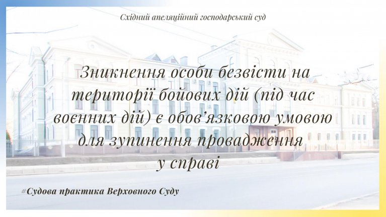 Верховний Суд у складі колегії суддів Касаційного господарського суду постановою від 25.06.2025 підтримав правову позицію суду апеляційної інстанції, зазначивши, що законом визначено обов'язок суду зупинити провадження у справі за обставин перебування сторони у складі Збройних Сил України. При цьому посилання скаржника про те, що зупинення провадження у справі має здійснюватися лише за клопотанням особи, яка перебуває на військовій службі, зроблені без врахування конкретних обставин цієї справи - зникнення боржника безвісти на території бойових дій (під час воєнних дій), а відтак і фізичної неможливості подання такого клопотання.