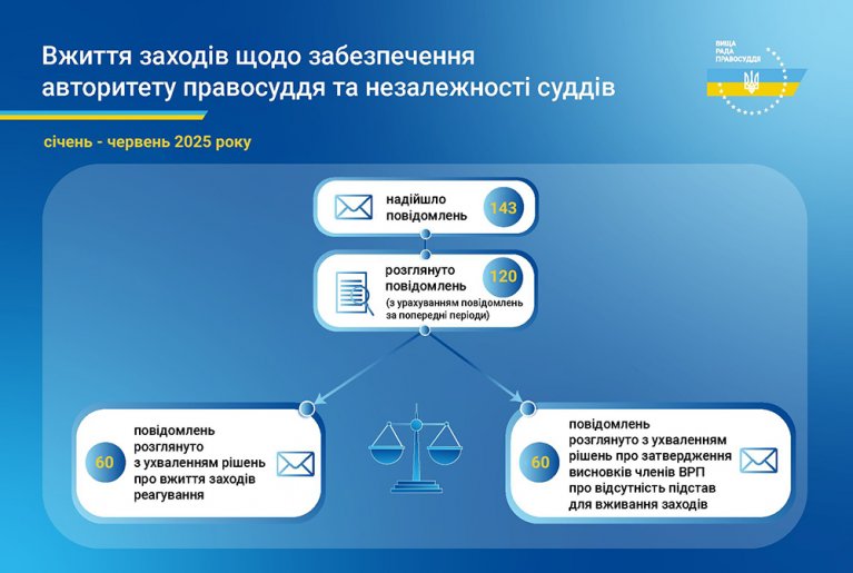 До Вищої ради правосуддяупродовж шести місяців 2025 року надійшло143 повідомлення про втручання у професійну діяльність суддів щодо здійснення правосуддя, про дії, що порушують гарантії незалежності суддів або підривають авторитет правосуддя, та 3 звернення Вищої кваліфікаційної комісії суддів України щодо дотримання гарантій незалежності.