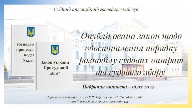 Сьогодні, 15 липня 2025 року, у газеті "Голос України" опублікований Закон України «Про внесення змін до деяких законодавчих актів України щодо вдосконалення порядку розподілу судових витрат та судового збору» від 18 червня 2025 року № 4508-ІХ, метою прийняття якого є вдосконалення порядку вирішення судами питань щодо судових витрат у господарському, цивільному та адміністративному судочинстві, а також забезпечення права фізичних осіб на судовий захист (https://www.golos.com.ua/documents/z-4508-ix.pdf).