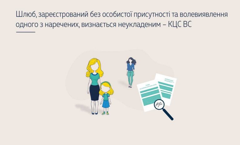 Переглядаючи оскаржені відповідачкою судові рішення, КЦС ВС погодився з висновками судів попередніх інстанцій та зазначив, що відповідно до ст. 48 СК України та пунктів 13, 14 Правил державної реєстрації актів цивільного стану в Україні при розгляді питання про неукладеність шлюбу суди перевіряють, чи були наречені особисто присутні під час державної реєстрації шлюбу, а також чи належить їм підпис у відповідних документах. Установивши відсутність волевиявлення чоловіка позивачки на укладання шлюбу, що підтверджено висновком експертизи, суди попередніх інстанцій правильно виходили з наявності правових підстав для визнання шлюбу неукладеним й анулювання актового запису.