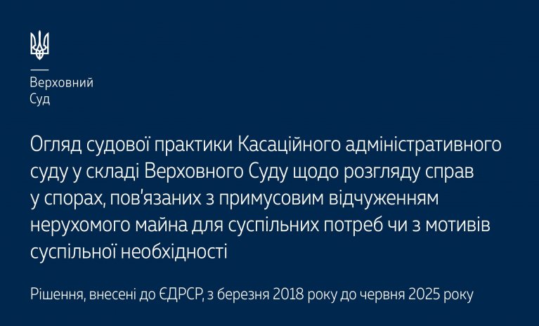 Пропонуємо ознайомитися з оглядом судової практики Касаційного адміністративного суду у складі Верховного Суду щодо розгляду справ у спорах, пов’язаних з примусовим відчуженням нерухомого майна для суспільних потреб чи з мотивів суспільної необхідності – https://court.gov.ua/storage/portal/supreme/ogliady/Oglyad_KAS_vidchygenna_majna.pdf.