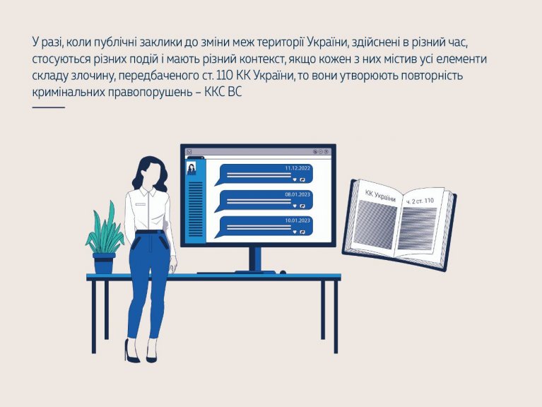 Верховний Суд взяв до уваги, що зміст здійснених залежно від обставин коментарів обвинуваченої щоразу був різний, стосувався різних подій, пов’язаних із повномасштабним вторгненням рф на територію України (перший – Соледару, другий – пам’ятників, а третій – Дніпропетровської області). Кожен цей ситуативно проведений коментар, визначений як відповідний заклик, не пов’язаний логічною думкою з іншими, мав різний контекст і проміжок часу (перший – 11 грудня 2022 року, другий – 8 січня і третій – 10 січня 2023 року). Водночас кожний заклик містив усі елементи складу злочину, передбаченого ст. 110 КК України. Таким чином, суди попередніх інстанцій дійшли обґрунтованого висновку про доведеність винуватості обвинуваченої у скоєнні повторно публічних закликів до вчинення умисних дій з метою зміни меж території України, які не були об’єднані єдиним кримінально протиправним наміром.