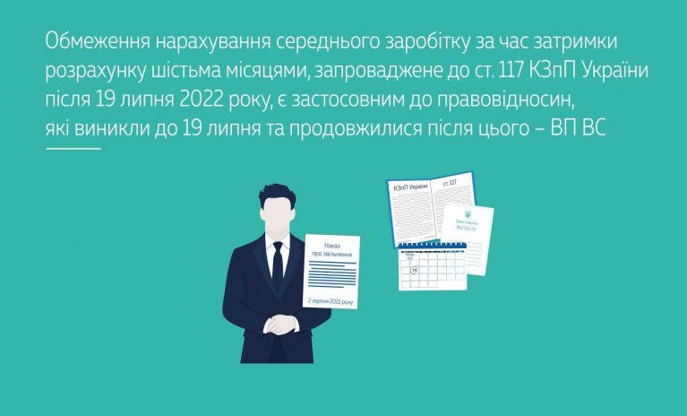 Водночас Велика Палата ВС дійшла висновку, що до правовідносин, які виникли до набрання чинності Законом № 2352-ІХ, проте не припинилися або припинилися після набрання ним чинності (триваючі правовідносини), з 19 липня 2022 року слід застосовувати положення ст. 117 КЗпП України в новій редакції та обмежувати нарахування середнього заробітку за час затримки розрахунку шістьма місяцями.