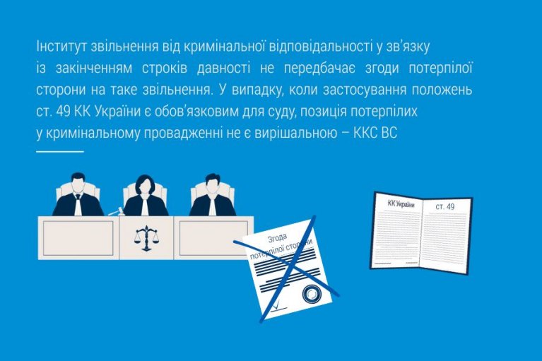 Інститут звільнення від кримінальної відповідальності у зв’язку із закінченням строків давності не передбачає згоди потерпілої сторони на таке звільнення. У випадку, коли застосування положень ст. 49 КК України є обов’язковим для суду, позиція потерпілих у кримінальному провадженні не є вирішальною.