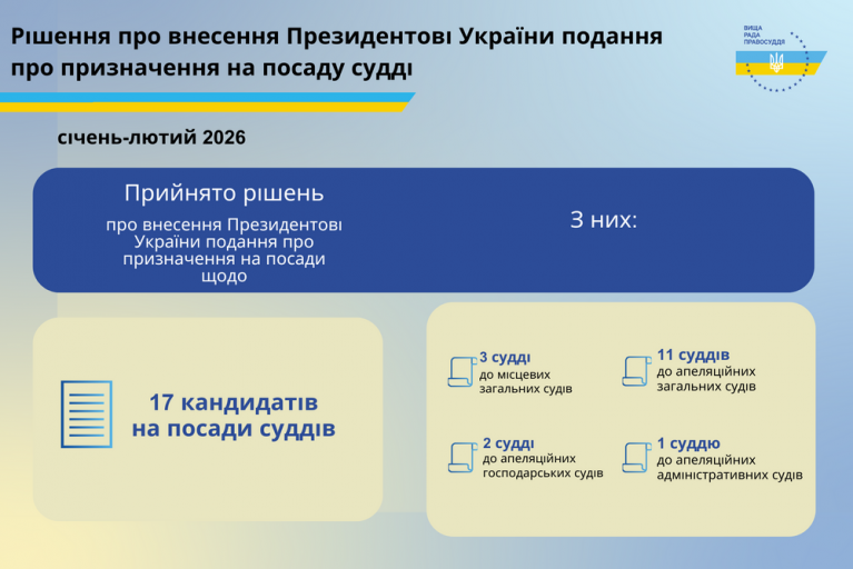 Протягом січня – лютого 2026 року Вища рада правосуддя ухвалила рішення про внесення Президентові України подання про призначення 17 кандидатів на посади суддів, з них: