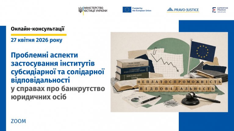27 квітня 2026 року відбудеться онлайн-консультація "Проблемні аспекти застосування інститутів субсидіарної та солідарної відповідальності у справах про банкрутство юридичних осіб". Захід організовує Міністерство юстиції України за підтримки Проєкту ЄС "Право-Justice".