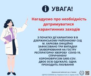 З початку дії карантину в Дзержинському районному суд м. Харкова офіційно зафіксовано три випадки захворювання на гостру респіраторну хворобу COVID-19, спричинену короновірусом SARS-CoV. Двоє осіб одужало, третя проходить курс лікування та перебуває на самоізоляції, її стан стабільний, захворювання проходить в легкій формі. Тестування осіб, що перебували у безпосередньому контакті з особами, що захворіли, дало негативний результат.