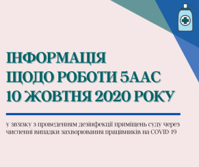 Повідомляємо, що у зв’язку з проведенням дезінфекції у приміщеннях 5ААС, ТИМЧАСОВО, 10 жовтня 2020 року будуть встановлені наступні обмеження:
