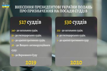 Для порівняння у 2019 Рада ухвалила рішення внести Президенту України подання про призначення 414 суддів до місцевих судів: 340 – до місцевих загальних судів; 19 – до місцевих господарських судів; 55 – до місцевих адміністративних судів.