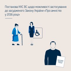Отже, наявні підстави для застосування до особи амністії згідно з п. «є» ст. 1 Закону України «Про амністію у 2016 році». Водночас колегія суддів ККС ВС не знайшла підстав для звільнення особи від додаткового покарання на підставі акта амністії.