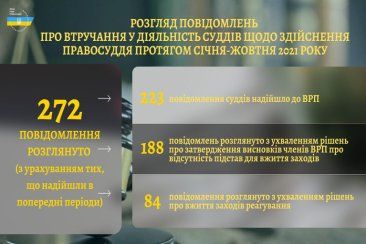 Із початку року до ВРП надійшло 223 повідомлення про втручання у діяльність суддів щодо здійснення правосуддя та дії, що порушують гарантії незалежності суддів або підривають авторитет правосуддя. З урахуванням повідомлень, які надійшли в попередні періоди, за перші десять місяців 2021 року Рада розглянула272 повідомлення.