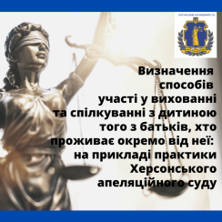 Перевіривши законність та обґрунтованість рішення суду в межах, визначених цивільним процесуальним законодавством, суд апеляційної інстанції визнав обґрунтованими висновки місцевого суду. Зокрема, колегія суддів Херсонського апеляційного суду зазначила, що суд першої інстанції визначаючи способи участі батька у спілкуванні та вихованні 11-річної дитини, надав системну оцінку фактам та обставинам у справі, зокрема, суд врахував, у першу чергу, інтереси дитини, її вік, психоемоційний стан, відносини батьків між собою, тривалість неспілкування з батьком, бажання дитини щодо присутності матері при зустрічах, та врахував принцип рівності прав батьків у вихованні дитини.