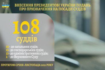 Протягом одинадцяти місяців 2021 року Вища рада правосуддя прийняла рішення про внесення Президентові України подання про призначення на посади 108 суддів: